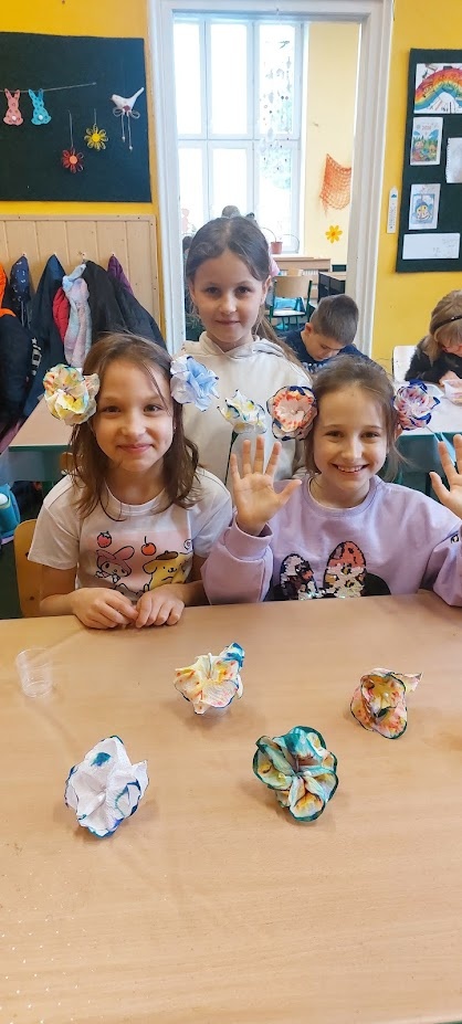 „Jaro dělá pokusy, vystrkuje krokusy…………,“ úryvek písně dvojice Svěrák – Uhlíř vystihuje naši výtvarnou činnost v družince. Recyklace či upcyklace se stává nedílnou součástí výtvarných a rukodělných technik. I děti v družince s recyklovatelným materiálem pravidelně pracují. Tentokrát jsme využili kuchyňské utěrky a toal. papír a vyzkoušeli jsme pokus s fixem a vodou. Jak se nám práce zdařila, posuďte sami.