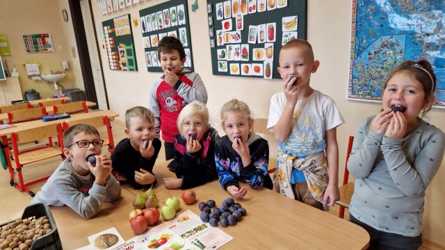 V rámci projektu „Ovoce a mléko do škol“ jsme obdrželi ochutnávkovou krabici se dvěma odrůdami jablek, dvěma odrůdami hrušek, švestky, mochyně, jádra vlašských ořechů a zdravé ovocné plátky vyrobené z jablek a švestek bez přidaného cukru, konzervantů, barviv a stabilizátorů. V hodině prvouky se děti nejdříve seznámily s jablky, hlavně s tím, co se skrývá uvnitř po jejich rozkrojení. Z domova některé děti znaly vánoční tradici krájení jablíček na hvězdičku. Když jsme jedno jablíčko rozkrojili napříč a objevila se hvězdička, všichni jsme měli velkou radost. Zajímavé bylo pro děti porovnávání šťavnatosti a sladkosti jednotlivých odrůd jablek a také zbarvení hrušky do červena, což nebývá obvyklé zejména v ilustracích knih a v učebnicích. Ochutnávku mochyně některé děti zatím vzdaly, protože s tímto ovocem neměly žádné zkušenosti a mnohým dětem se po zakousnutí zkřivil úsměv na tváři. Zato o vlašských ořechách již toho hodně ví. Znají, na jakém stromě rostou, protože se podílely na sběru ořechů a nyní pomáhají při jejich sušení a třídění. Už se těšíme, až se stanou součástí nějaké dobroty, kterou si v pracovních činnostech připravíme. Děkujeme, že jsme dodávku ovoce i mléčných výrobků mohli edukativně využít. Druhá ochutnávka se týkala porovnávání chutí různých druhů polotvrdých sýrů, které u dětí měly velký úspěch.