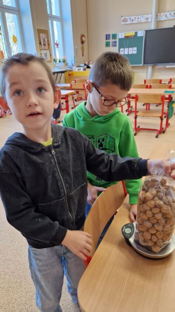 Vánoční jarmark se pomalu blíží a vy už se určitě těšíte nejen na krásné zpívání a rozsvícení vánočního stromu, tvořivé dílničky, ale také na náš VÁNOČNÍ JARMARK. Náš školní ořešák nám letos poskytl hezkou úrodu vlašských ořechů, které pomáhali naši prvňáčci sbírat, sušit, přebírat a nyní v předjarmarečním čase je připravovali pro prodejní stánek. V matematice sice počítáme do pěti, ale s kuchyňskou váhou si děti docela dobře poradily. Nejdříve odhadem naplnily sáček podle vizuálního vzoru a následně oříšky ubíraly nebo přidávaly, aby navážily 1 kg. Hmotnost na váze je uváděna v gramech, ale s tisícovkou na displeji děti neměly žádný problém. Jsou to prostě šikulové!