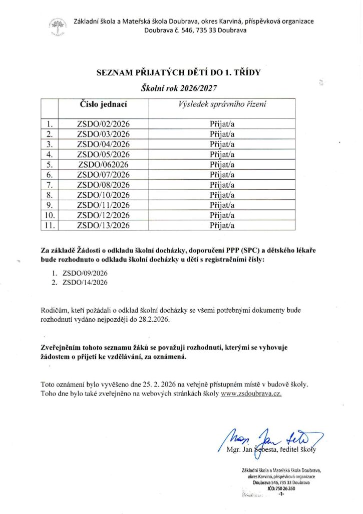 Seznam přijatých žáků