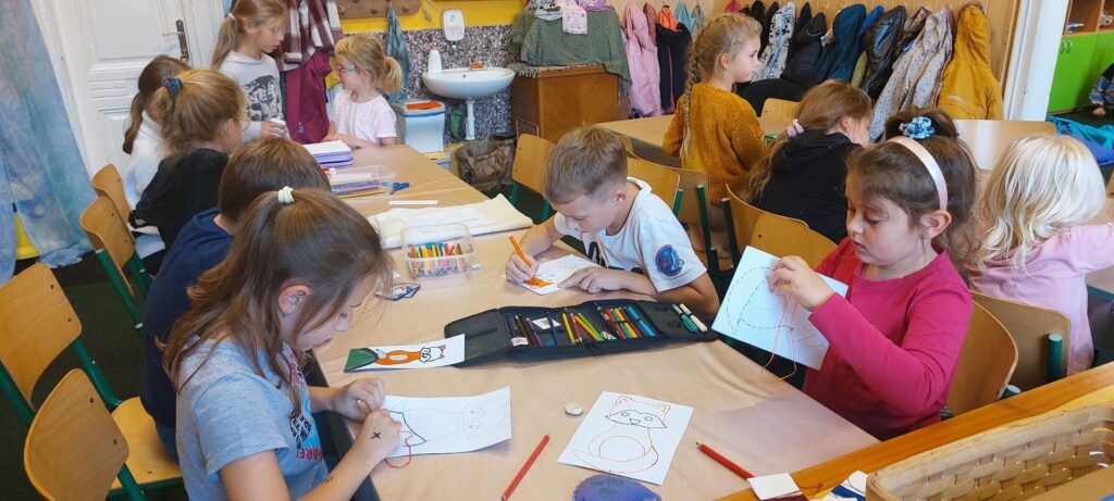 Kolorovaná malba, skládání papíru, vyšívání na papír – tvořivé činnosti, kterými děti družinky vytvořily podzimní dekorace. Sami se podívejte, jak se jim práce zdařila.