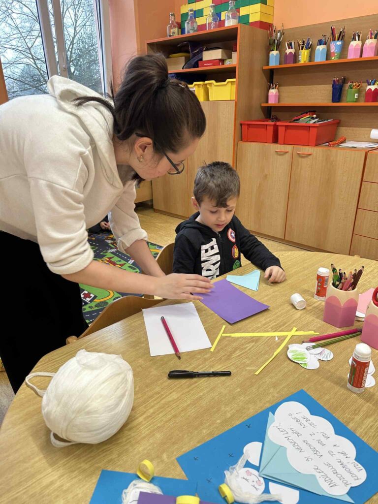 Práce s papírem, nůžkami, lepidlem a barvami patří mezi oblíbené činnosti. Děti si vyzkoušely stříhání, skládání i lepení jednotlivých částí a postupně tak vytvářely své vlastní obrázky.